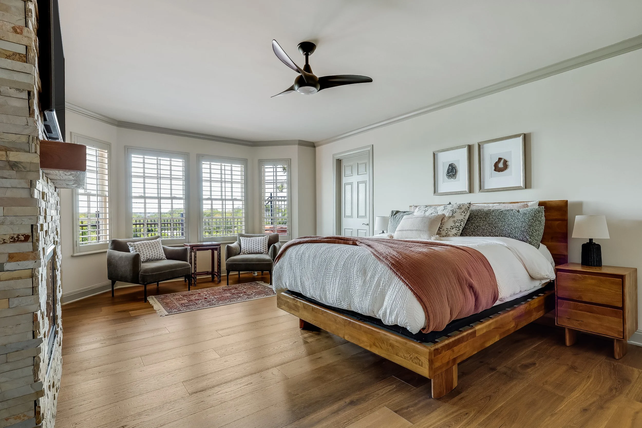 Set high in Northwest Hills with sweeping Cat Mountain views, this beautifully updated 4-bed, 3.5-bath home blends warmth, style, and function. The main living area is filled with natural light and features soaring ceilings, a cozy fireplace, and built-ins—all opening to your private pool and expansive 1400 SqFt deck. The kitchen is inviting and modern, with stainless appliances, fresh tile, painted cabinets, and updated hardware. The spacious primary suite on the main level includes its own fireplace, a spa-like bath with a steam shower, and custom walk-in closet. A formal dining room, designer powder bath, and storage-filled laundry room complete the first floor. Upstairs offers a second living area with panoramic views, three additional bedrooms, and two full baths—all with custom design details and thoughtful storage. Enjoy sunsets from the deck, a low maintenance, xeriscaped front yard with a charming fountain, and a circular driveway shaded by mature trees. Located in minutes from top-rated schools, parks, restaurants, and downtown Austin—this home truly has it all.