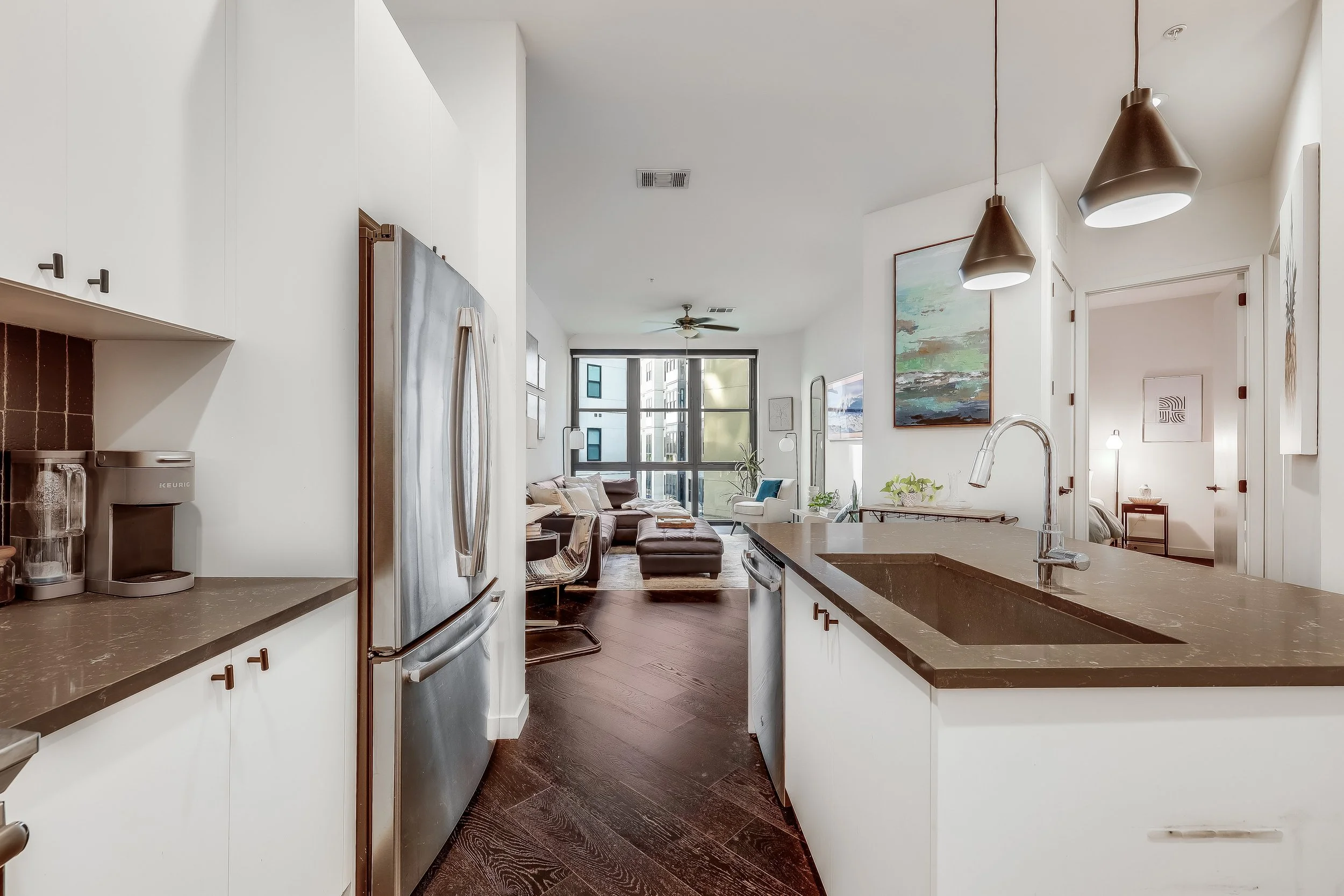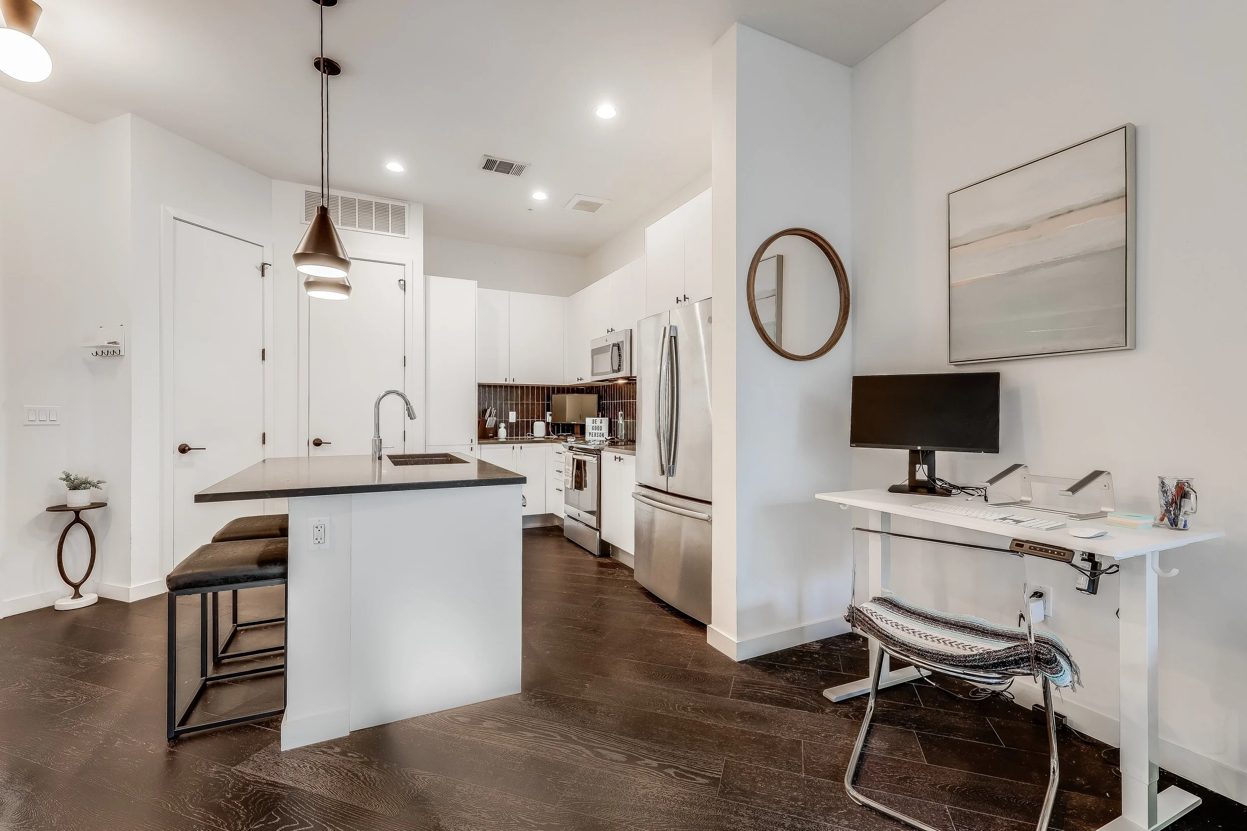 Built in 2018, Tyndall is perfectly situated in East Austin with walkability to downtown, UT Campus, Dell Medical School, and everything amazing about the East side. Walk to Saltillo Plaza, Franklin’s BBQ, and endless options on East 6th and 11th Streets! The resort-like amenities feature a pool with one of the best views of downtown, BBQ Grills, outdoor kitchen, fire pit, covered outdoor lounge space, gym, indoor resident lounge, conference rooms, and a dog run. Tyndall offers 24 hour concierge with amazing onsite staff, gated parking, and secured doors around the perimeter of the building. Park your car in your assigned parking spot and take the elevator directly to your unit floor. Inside, this 1 bed/ 1 bath unit includes an open floor plan with a large kitchen with a center island and bar seating, space for optional dining, and a living room with floor to ceiling windows (that open!) overlooking the courtyard. The bedroom features a walk-in closet and direct access to the bathroom with dual sinks and floor to ceiling storage. The window “nook” in the bedroom is the perfect desk area for those that work from home. Both closets have California Closet systems installed to help you maximize storage. Laundry is located in the unit. High ceilings and bright light make this perfect floor plan feel large and inviting!